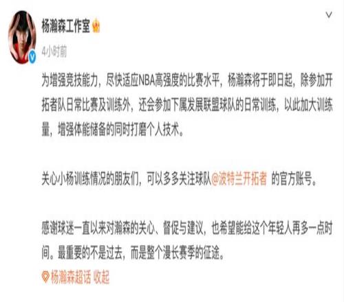 关于此次下放,杨瀚森工作室更新社媒写道:“为增强竞技能力,尽快适应NBA高强度的比赛水平,杨瀚森将于即日起,除参加开拓者队日常比赛及训练外,还会参加下属发展联盟球队的日常训练,以此加大训练量,增强体能储备的同时打磨个人技术。关心小杨训练情况的朋友们,可以多多关注球队的官方账号。感谢球迷一直以来对瀚森的关心、督促与建议,也希望能给这个年轻人再多一点时间。最重要的不是过去,而是整个漫长赛季的征途。”