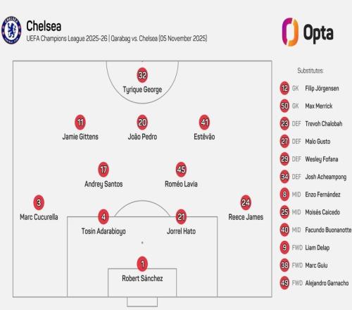 切尔西即将在欧冠联赛阶段第4轮客场挑战卡拉巴赫,目前他们已经公布了球队的首发阵容。切尔西在本场比赛中排出的首发阵容平均年龄只有23岁97天,这也是英格兰球队在欧冠客场比
